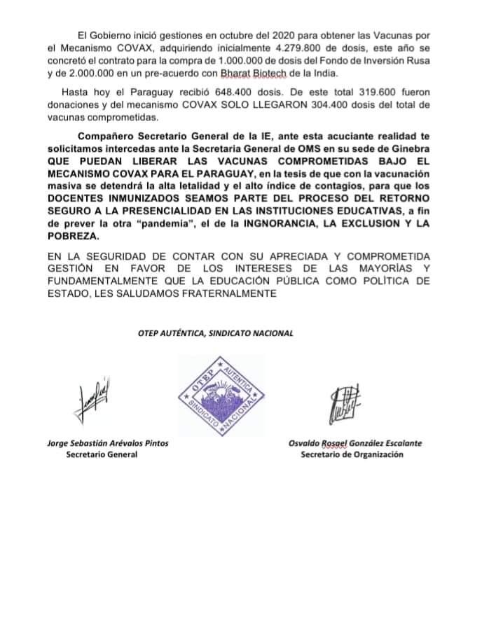 LA OTEP AUTÉNTICA SINDICATO NACIONAL SE DIRIGIÓ A LA INTERNACIONAL DE LA EDUCACIÓN MEDIANTE UNA NOTA, EN EL MARCO DE LA CAMPAÑA «¡TODOS POR LAS VACUNAS YA! ¡A TODOS Y TODAS SIN EXCLUSIÓN ALGUNA!