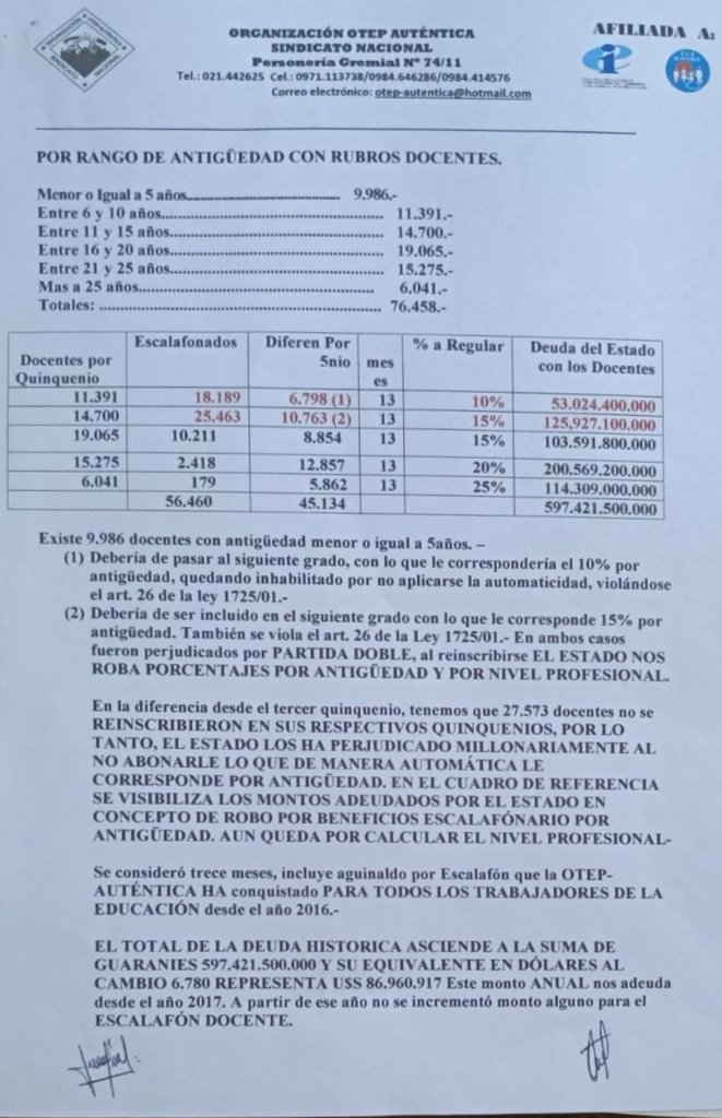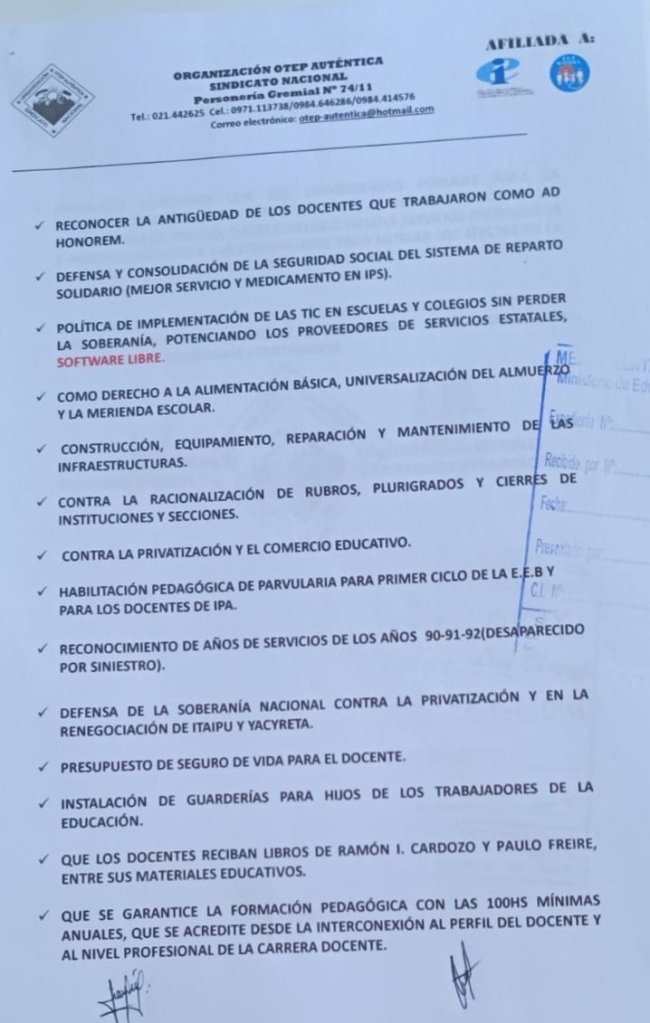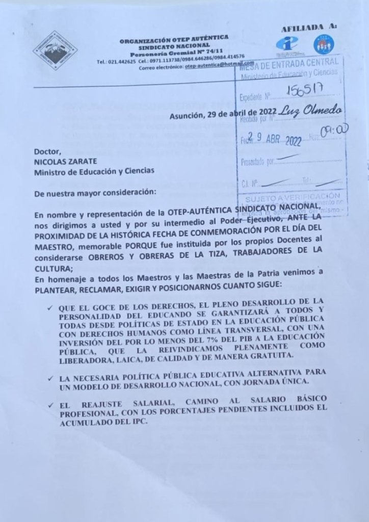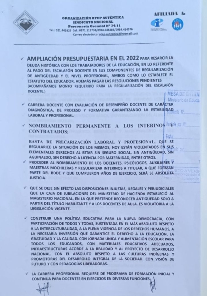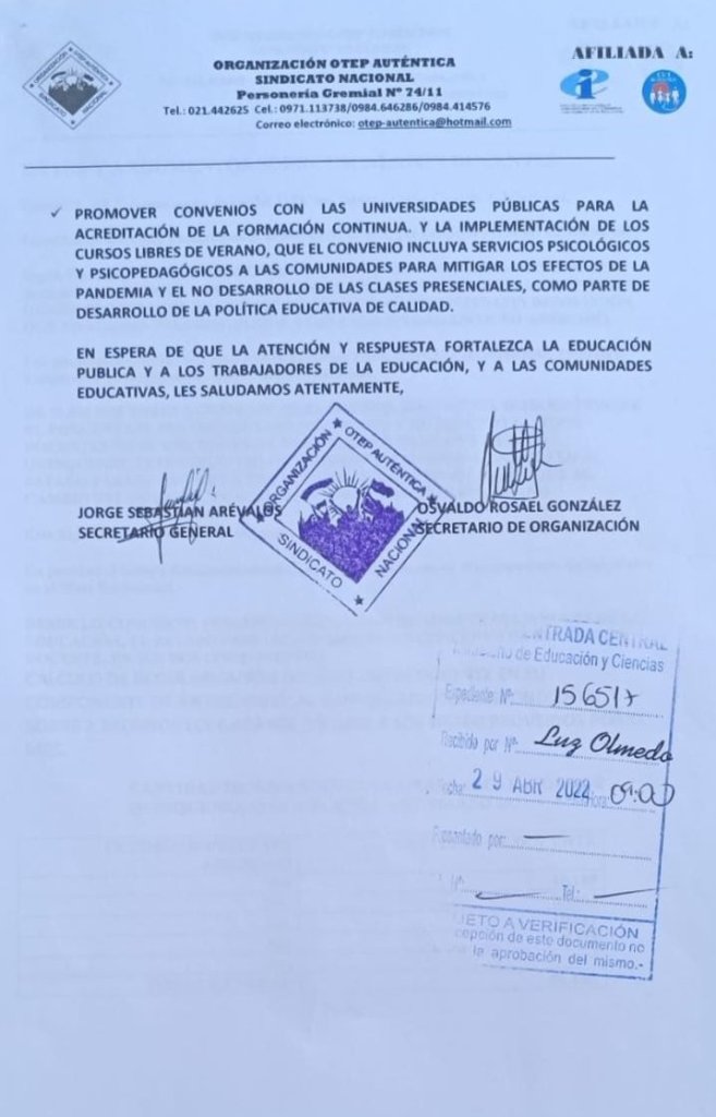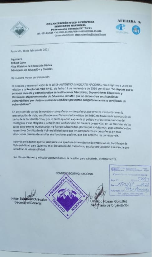 En la fecha entregamos la nota conteniendo las necesidades y exigencias de la Comunidad Educativa además del posicionamiento de la Organización OTEP – AUTÉNTICA SINDICATO NACIONAL ante los próximos desafíos.